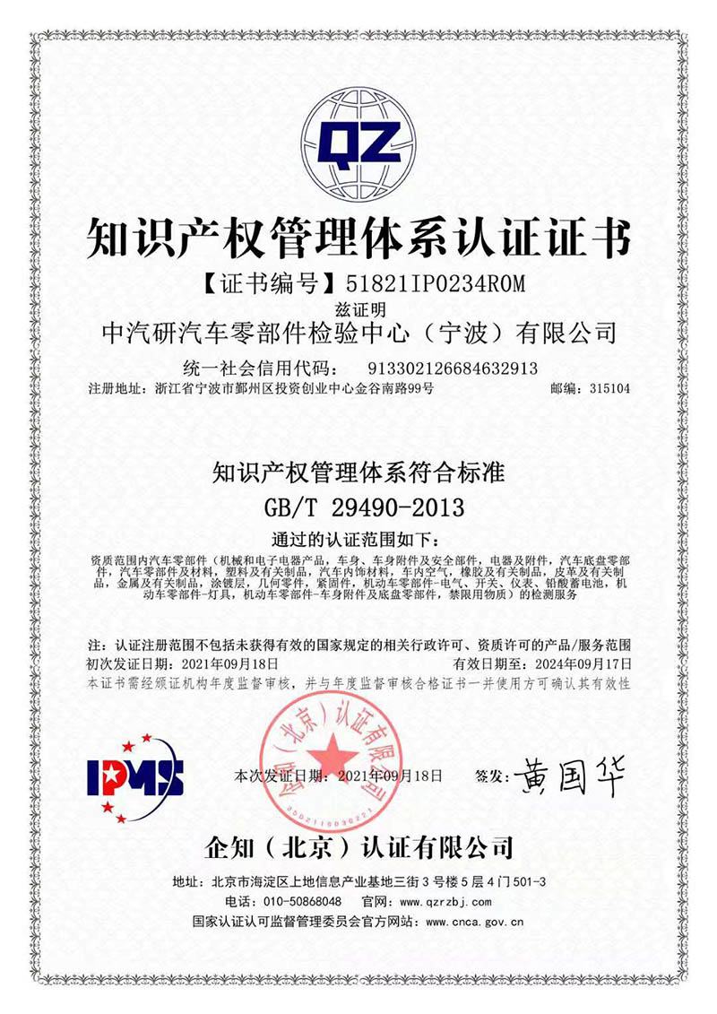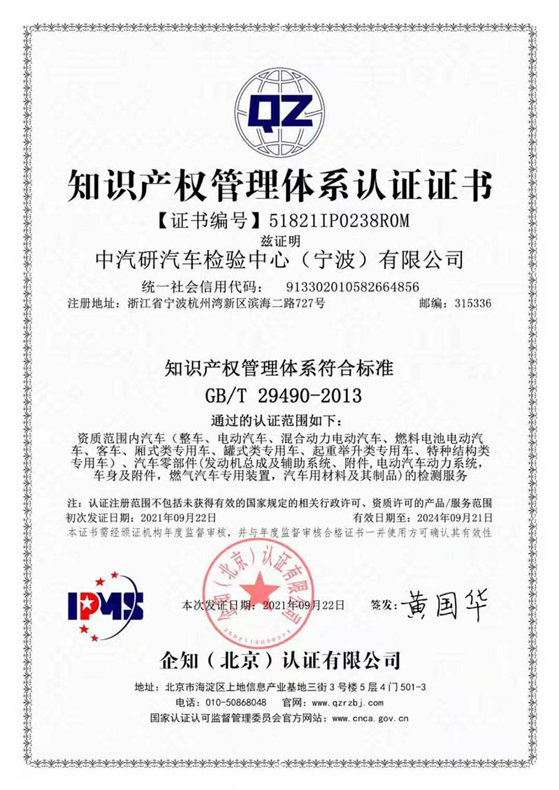 2021年9月22日,寧波檢驗(yàn)中心下屬中汽研汽車(chē)檢驗(yàn)中心(寧波)有限公司、中汽研汽車(chē)零部件檢驗(yàn)中心(寧波)有限公司順利通過(guò)知識(shí)產(chǎn)權(quán)管理體系認(rèn)證。