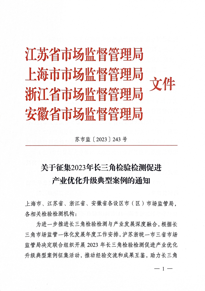 2023年10月18日,江蘇、上海、浙江和安徽市場監督管理局聯合印發關于征集2023年長三角檢驗檢測促進產業優化升級典型案例的通知(蘇市監〔2023〕243 號)。